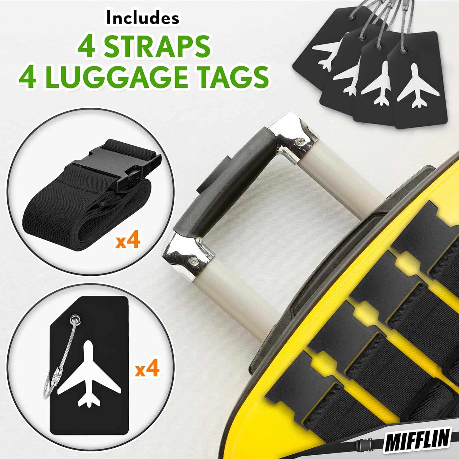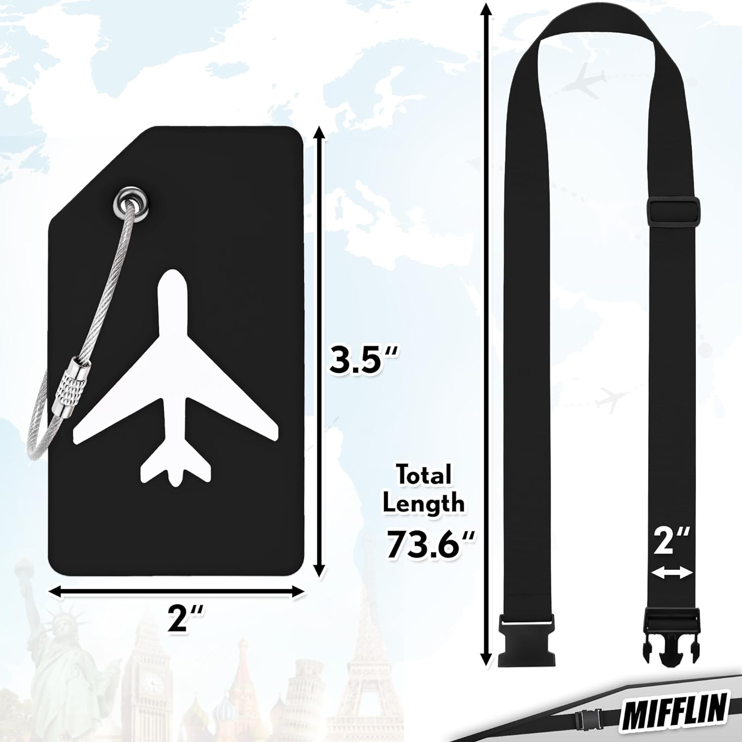 • INCLUDES – 4 Black nylon luggage straps & 4 Black silicone luggage tags