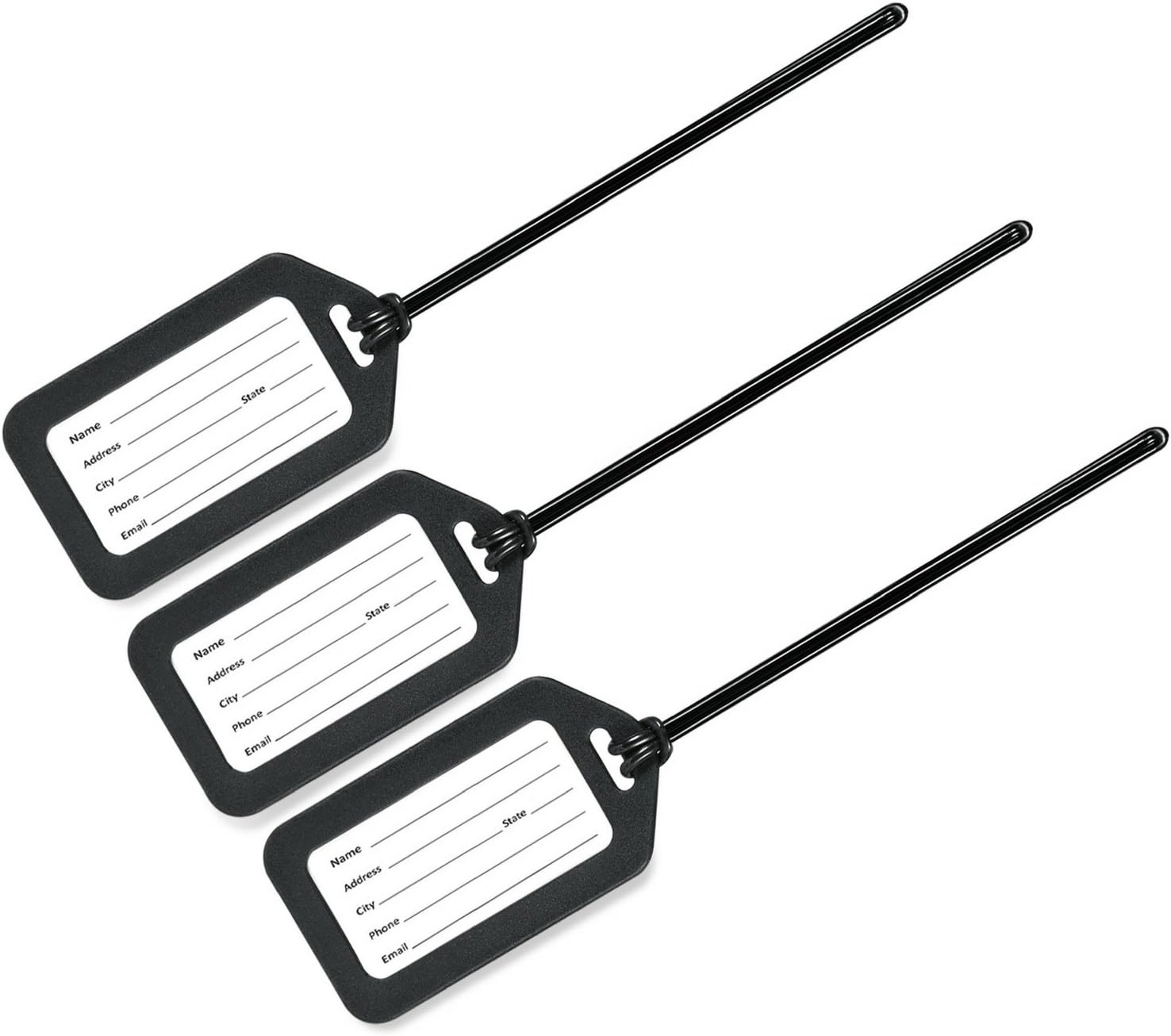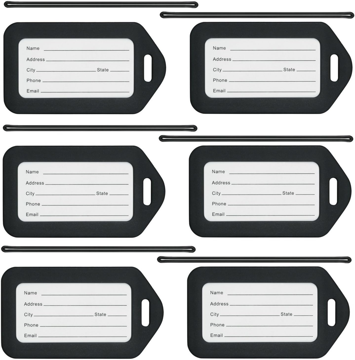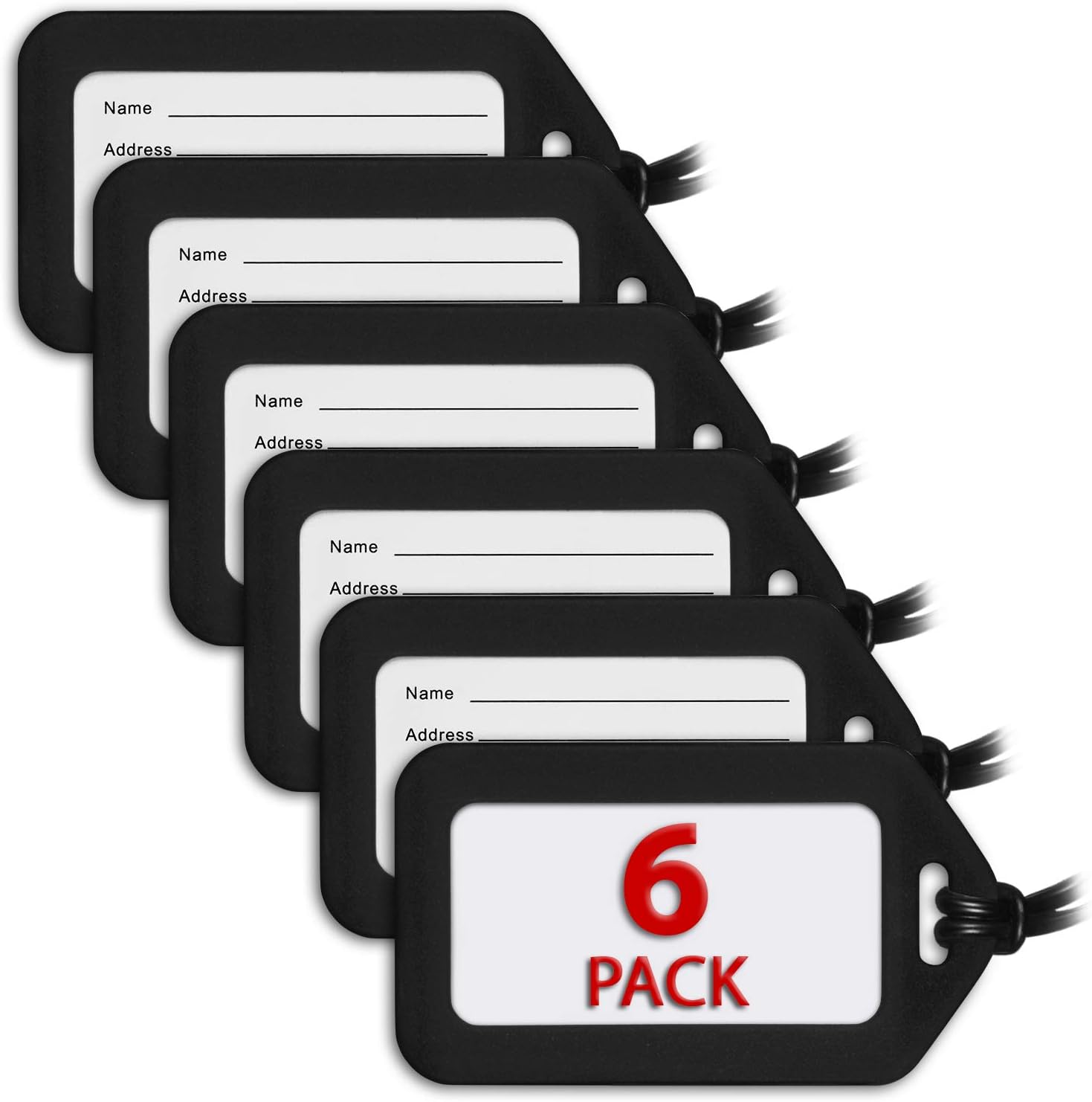 - INCLUDED – 6 black luggage tags, 6 name tag inserts, clear protective film to protect against dirt and moisture, and 6 dense vinyl strap connector ties